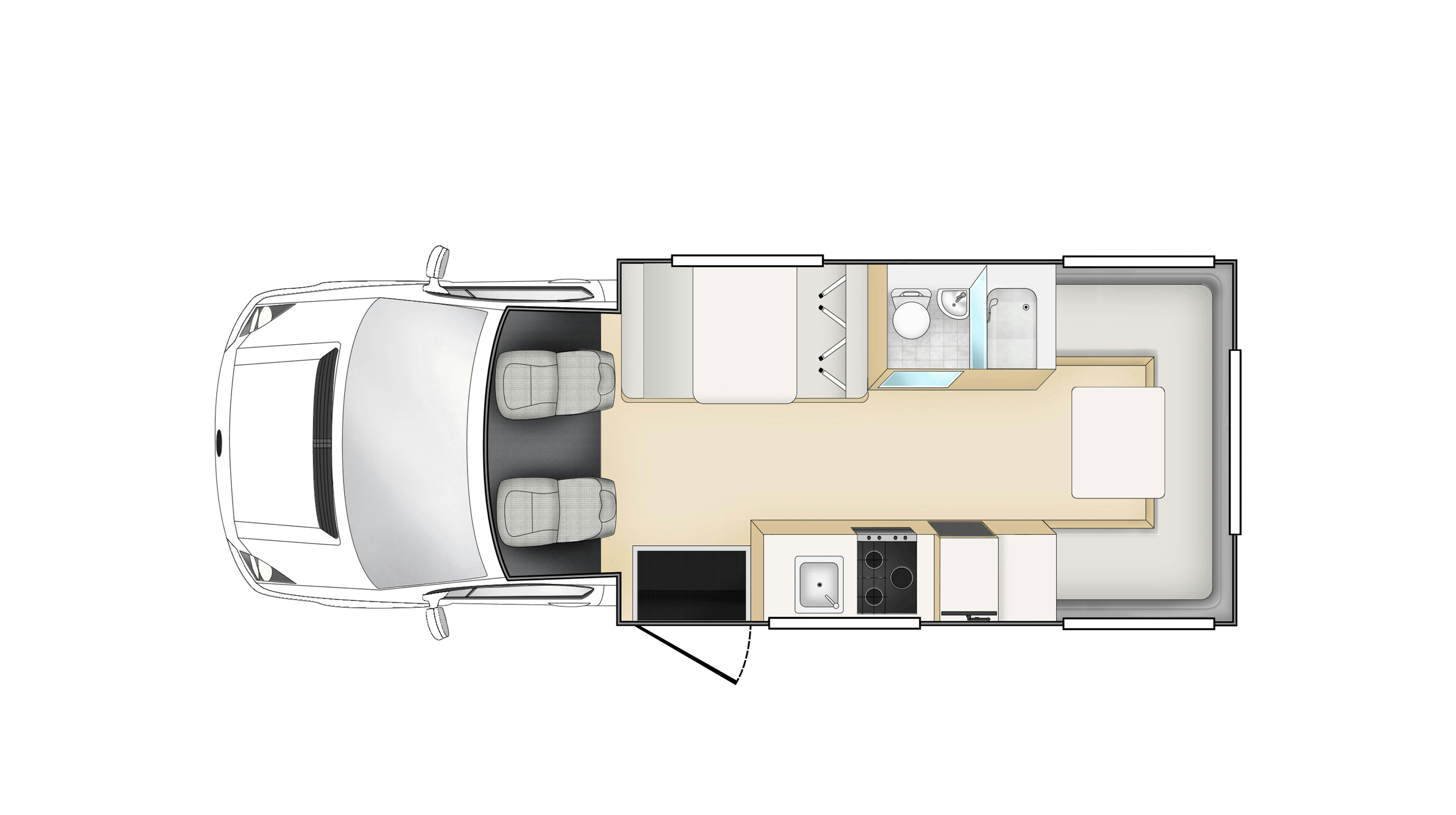 Fahrzeugausstattung: Sicherheitsnetz, Klimaanlage, Heizung, Radio, Media Player, Rückfahrkamera, Feuerlöscher, Dusche, Toilette, Kalt- und Warmwasser, 1 x 4kg Gasflasche, 3 Herdplatten, 110 L Kühl-/Gefrierschrank, Mikrowelle, Kochutensilien, Geschirr