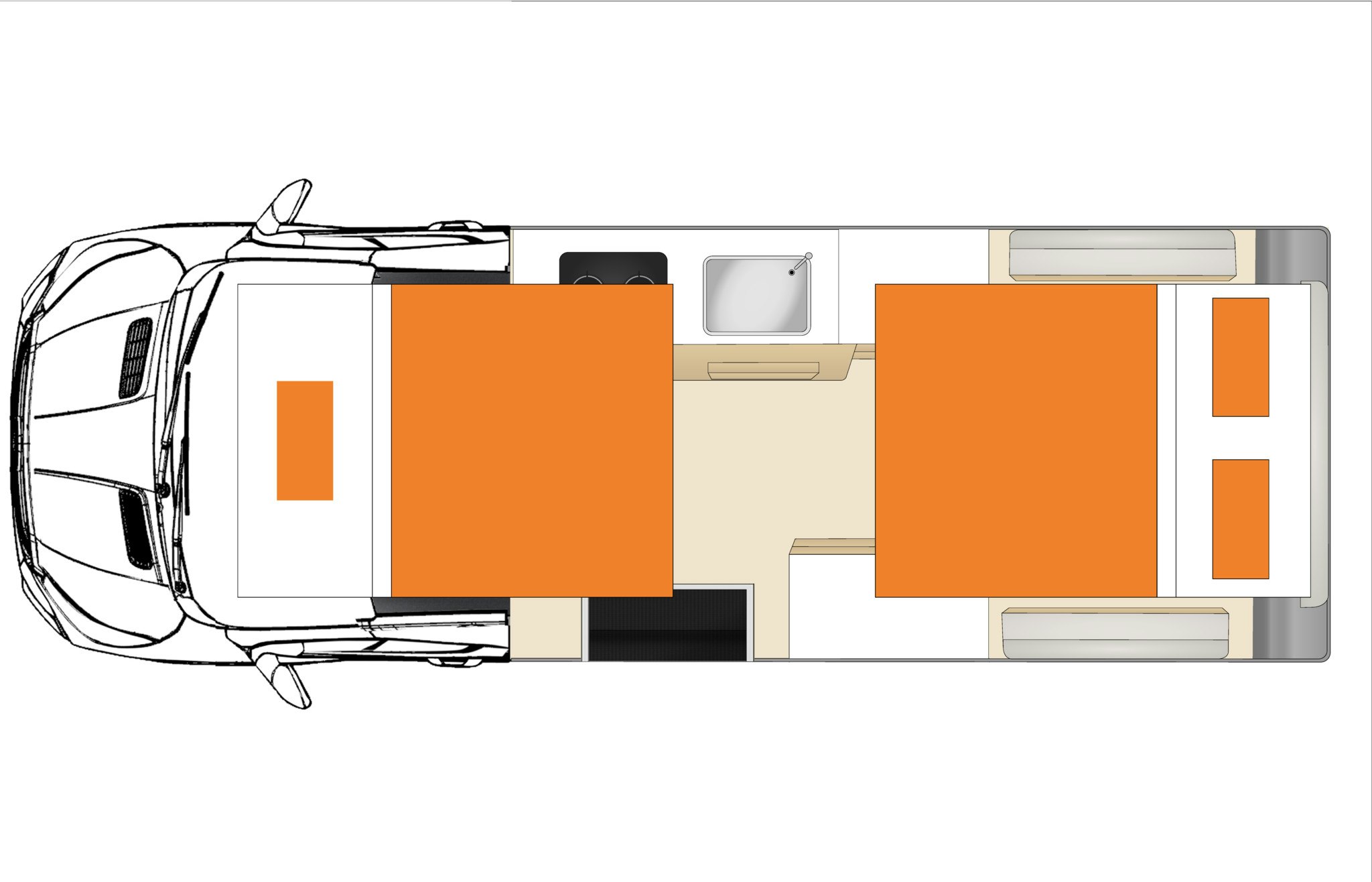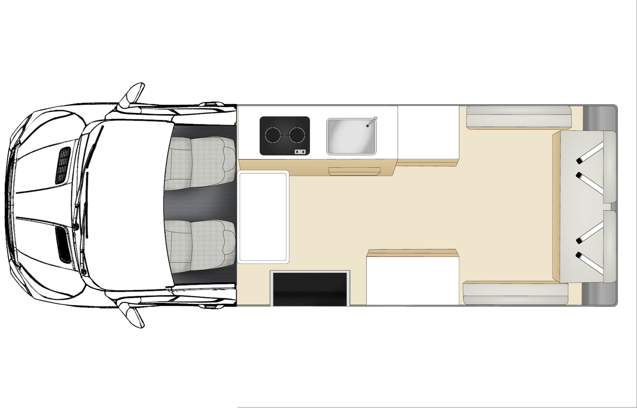 Fahrzeugausstattungen: Klimaanlage, Heizung, Kalt- und Warmwasserversorgung, 2 Herdplatten, 1 x 9kg Gasflasche, 60 L Kühl-/Gefrierschrank, Mirkowelle, Kochutensilien, Geschirr